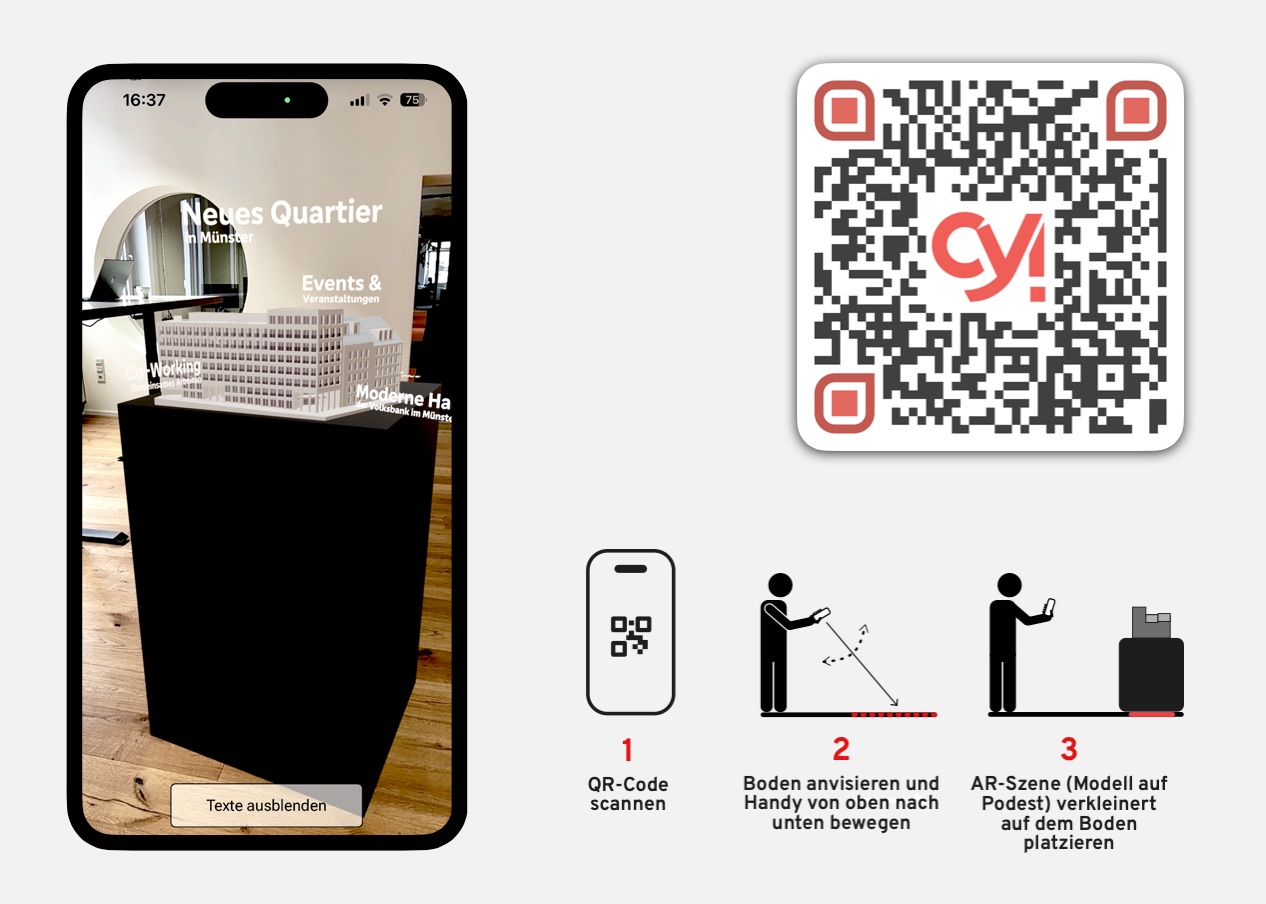 Mit einem QR-Code-Scan können sich Interessierte das Modell der neuen Hauptstelle direkt ins eigene Wohnzimmer holen.