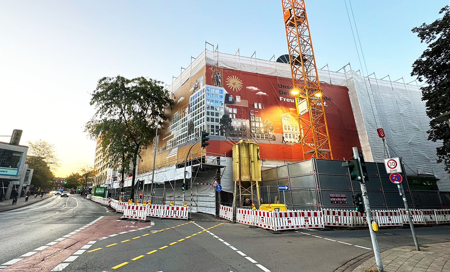 Mit Gerüstbannern wird das Baugerüst zum Fenster in die Zukunft. An der Vossgasse und der Neubrückenstraße ziehen derzeit zwei außergewöhnliche Gerüstbanner die Aufmerksamkeit auf sich. Unter dem Motto „Raum für Neues” symbolisieren sie den Wandel und eröffnen zugleich einen Blick in die Zukunft. Mit QR-Codes werden Passant:innen zu Entdecker:innen der neuen Hauptstelle. Sie können diese in Augmented Reality erleben – plastisch in 3D, mitten im Stadtbild oder bei sich zu Hause.